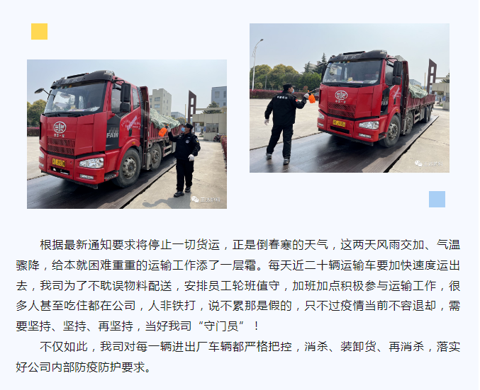 ● 自從接到通知,貨車進(jìn)出必須申報(bào)、申領(lǐng)通行證,我司立刻作出反應(yīng)并嚴(yán)格按照要求落實(shí)閉環(huán)管理,從入宜卡口到公司期間司機(jī)不下車,到公司之后“即停即卸即裝即走”,裝卸貨期間司機(jī)不下車。