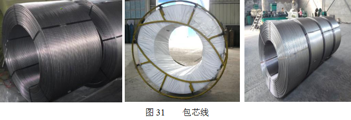 針對不同鋼種精煉過程中的精煉目的不同,我公司成功開發(fā)出系列包芯線:有以球化鋼中非金屬夾雜以利于排除的鈣系包芯線如鈣鐵線、硅鈣線、純鈣線;有以成分微調(diào)為主要目的的碳線;還有以合金化和提高合金收得率為主要目的的鈦鐵線等。使用這類包芯線,可實現(xiàn)不同鋼種的不同精煉目的,做到精確控制,達到降低處理成本的目的。包芯線外形如圖31,理化指標見表37、38。